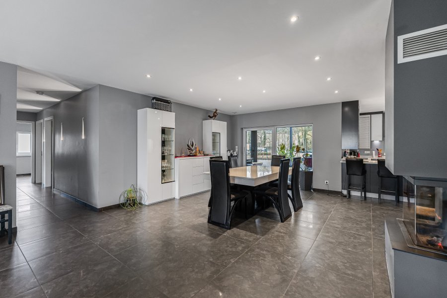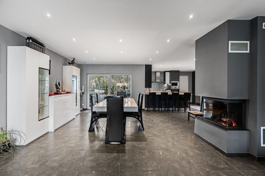 - Un grand salon salle à manger avec cheminée avec cuisine ouverte et accès terrasse et jardin avec vue imprenable sur la verdure